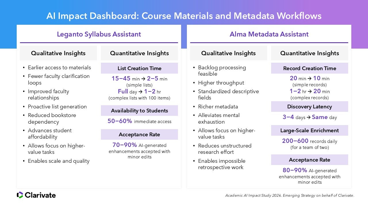 Emerging Strategy. (2026). Academic AI Impact: Measuring the Impact of AI Adoption on Academic Library Workflows. Commissioned by Clarivate.
