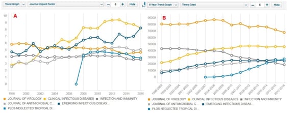 Graph B shows a trend graph with Times Cited calculated over a series of overlapping five-year windows from 1998 through 2016. By this measure, the Journal of Virology is clearly the most-cited of the selected publications, while Clinical Infectious Diseases rose to the #2 spot, having occupied third place for the period 1998 to 2002.