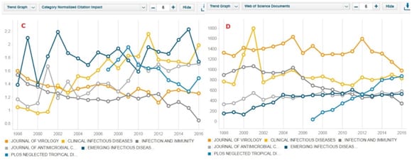 Above, Graph C indicates the Category Normalized Citation Impact (CNCI) score, which was developed for InCites but does not appear as part of Journal Citation Reports. CNCI is a telling statistic, since it is not affected by the size of the journal but will calculate the accumulation of each individual article while normalizing for different fields and publication years. As the graph shows, the #1 journal within the six is Emerging Infectious Diseases. Also, according to the CNCI measure, Clinical Infectious Diseases has seen its influence steadily increase.
