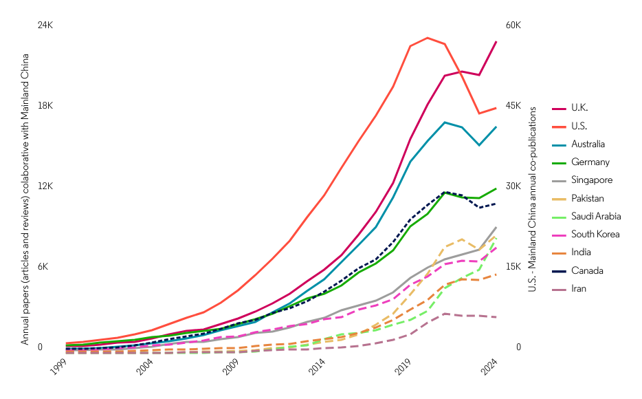While collaboration with Western economies dipped between 2021 and 2022, it has since rebounded. Mainland China’s collaboration with Germany, Australia and especially the U.K. has recovered to pre-2021 levels, but this is not the case for Canada and especially the U.S. Notably, Mainland China’s partnerships with countries in the Middle East and Asia – including Iran, South Korea, and Saudi Arabia – showed resilience during this period, suggesting a strategic pivot toward emerging regions.