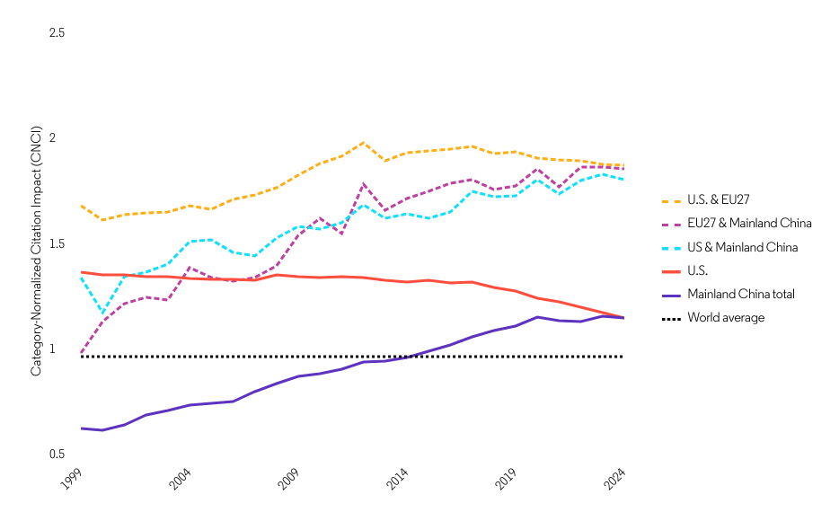 Mainland China’s CNCI has risen steadily over the past 15 years while the U.S. average has declined, and they are now similar. The CNCI of their joint papers is higher than the overall U.S. average, underscoring the continuing value of international partnerships – and the risks of disengagement.