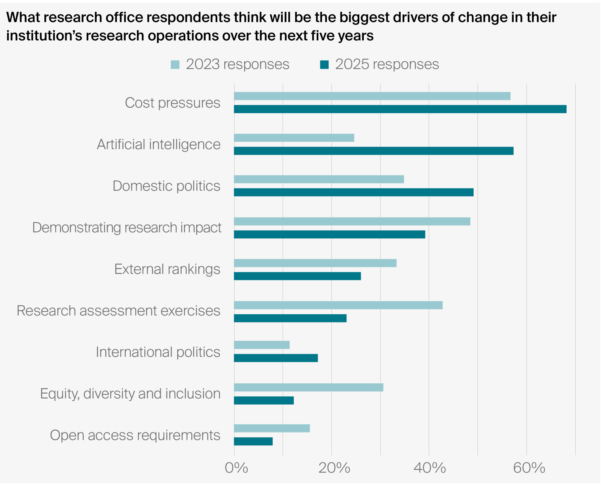 In the two years since our last survey, there has been no escaping the rise of artificial intelligence. The proportion of research office staff putting AI in their top three “change drivers” has jumped from just a quarter (25%) in 2023 to significantly more than half (57% in 2025).