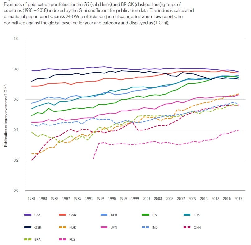 Our findings include the observation that Germany and the United States have tended to display a more even balance of subject concentration over recent decades. Meanwhile, Mainland China and South Korea, for example, have moved from an initial footing of greater specialization toward increased balance.