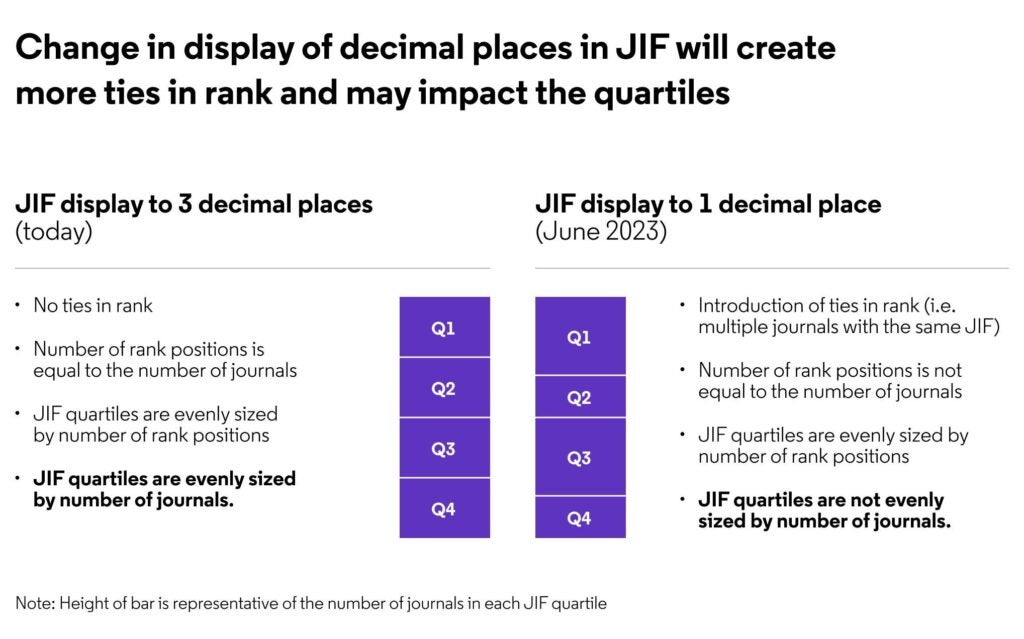 今年はJIFをAHCIとESCIに拡大して小数点以下1桁表示に移行し、来年はAHCIとESCI誌をカテゴリーランキングに導入することで、それぞれの変更がJIFランキングや四分位にどのように個別に影響するかについて透明性を持たせるためです。