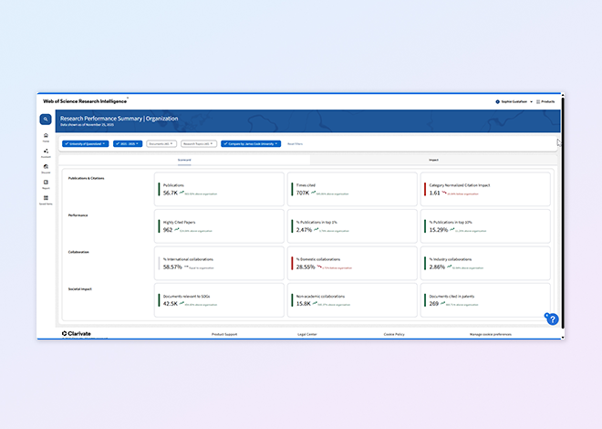 Web of Science Research Intelligence enables institutions to build high-impact teams, discover grants, and clearly demonstrate the outcomes that funders, stakeholders, and society care about—turning research excellence into measurable results.