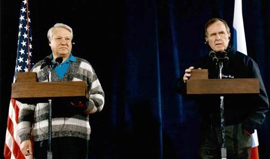 1992 年 2 月 1 日,布希總統和俄羅斯總統葉爾欽在大衛營舉行的新聞發佈會上宣佈冷戰結束。