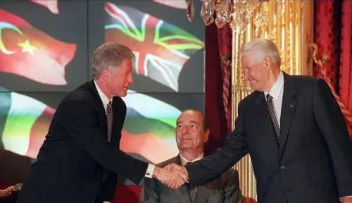 1997 年 5 月 27 日,美國總統比爾·柯林頓在巴黎舉行的北約-俄羅斯成立法案簽字儀式上與俄羅斯總統葉爾欽握手,法國總統席哈克在一旁觀看。