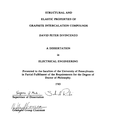 David P. DiVincenzo 教授1983年獲賓夕法尼亞大學電氣工程博士學位,導師為Eugene Mele 教授(賓夕法尼亞大學著名的拓撲物理學家)。其博士論文題目為:Structural and Elastic Properties of Graphite Intercalation Compounds (LITHIUM) 。該論文全文收錄在ProQuest全球博碩士論文資料庫(ProQuest Dissertations & Theses Global,簡稱PQDT Global) 中。以下是論文的相關資訊,讀者可點擊連結查閱論文。
