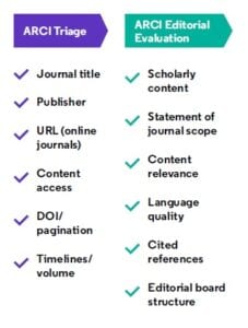وبعد ذلك تخضع المجلة لاستعراض مجلس التحرير لتأكيد أنها علمية، وذات مجال أو مهمة واضحة، وتضم ملخصات للمقالات، ومراجع مستشهد بها، وأن هناك صلة واضحة بين مجال المجلة ومحتواها، وأن جودة لغة المقال تتسق مع لغة التواصل العلمية وأن مجلس التحرير يعبر عن المجال الذي تتخصص به المجلة. تضمن عملية الاختيار هذه جودة الكشّاف العربي للاستشهادات المرجعية (ARCI)، الأمر الذي يسهم في القيمة الإجمالية للكشّاف داخل المنطقة العربية والعالم أجمع.