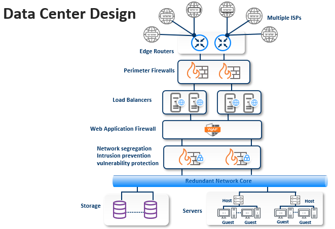 Redundant infrastructure devices – no single point of failure (routers, switches, firewalls, load-balancers, storage arrays, etc.)