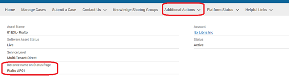 To locate your hosted instance name on the Support Portal (Salesforce), simply log onto the Support Portal and select the desired account asset. If your environment is on the system status, your instance name will be displayed under the Instance Name on Status Page.