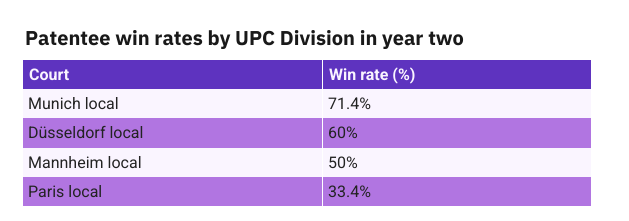 With patentee win rates ranging from 71.4% in Munich to 33.4% in Paris, forum choice can meaningfully shift risk. For patentees, Munich currently presents the most favorable merits landscape. For defendants, Paris and Mannheim offer comparatively lower patentee success rates.