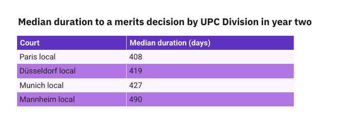 Merits decisions take 408–490 days, depending on division. Besides the fact that UPC, merits timelines are quite efficient, this data reveals meaningful differences across divisions.