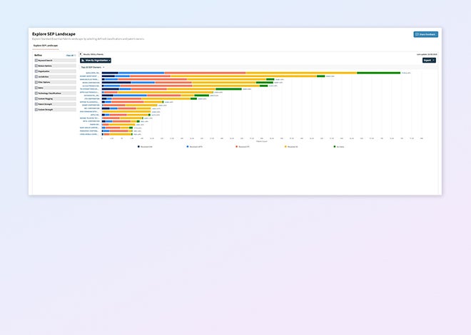 Quickly analyze declared standard essential patents with clean, structured data. Understand ownership structures, benchmark competitor portfolios and bring clarity to FRAND negotiations — all in seconds.