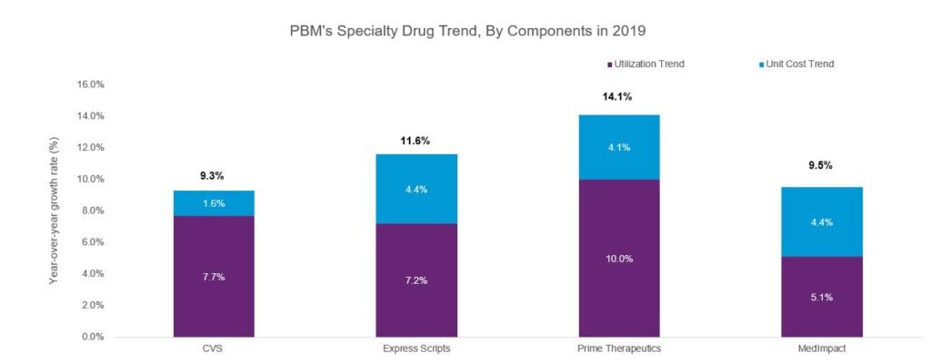 While big PBMs like ESI and CVS Caremark promote exceptional market control through their 2019 PBM trend reports, Prime Therapeutics failed to effectively control drug price inflation. In line with the trend for slow growth, commercial drug spending grew at an average of three percent. While drug utilization remains the leading cause of increasing specialty drug spend for most PBMs, MedImpact’s cost management strategy has not worked well in 2019.