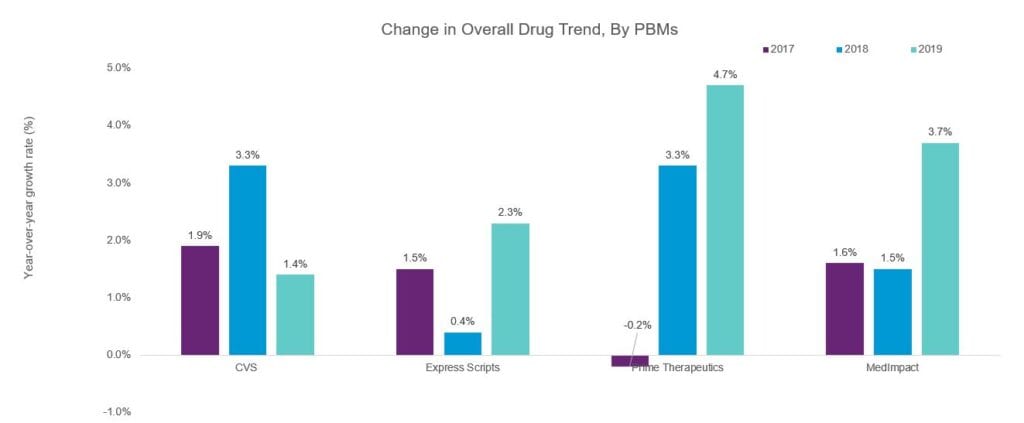 The chart below compares overall drug trend figures for CVS, Express Scripts, Prime Therapeutics and MedImpact, 2017 to 2019.