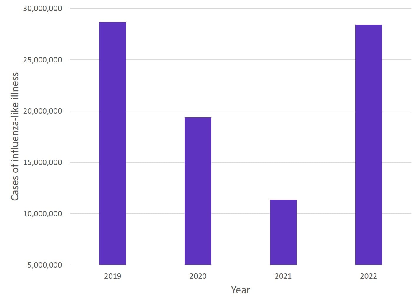 Assuming we have a population-wide vaccination program completed before the 2021/2022 influenza season, we should see comparable drops in total cases, albeit spread throughout the 2020 and 2021 calendar years given the split impact between these two seasons.
