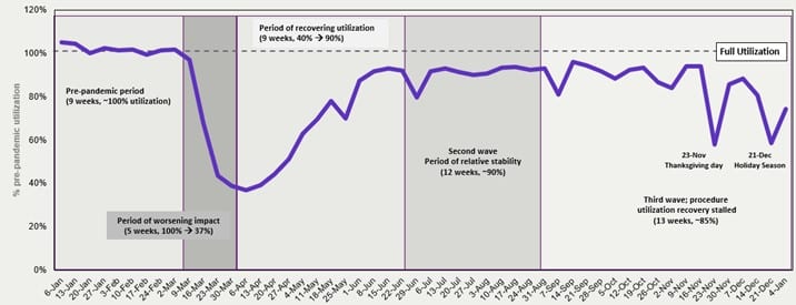 ヘルスケアおよび医療機器業界が回復するスピードは、COVID-19ワクチンの入手可能性や展開、公衆衛生対策、施設のキャパシティなどの短期的要因と、統合や病院以外の環境の重要性の高まりなどの長期的要因の両方に左右されます。