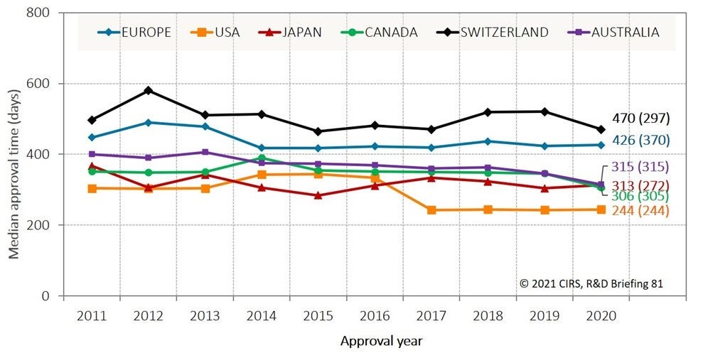 欧州医薬品庁(EMA)、米国食品医薬品局(FDA)、日本の独立行政法人医薬品医療機器総合機構(PMDA)、カナダ保健省、スイス医薬品局、オーストラリア治療薬局(TGA)の審査承認時間を分析した結果、3つの大きな傾向が明らかになりました。
