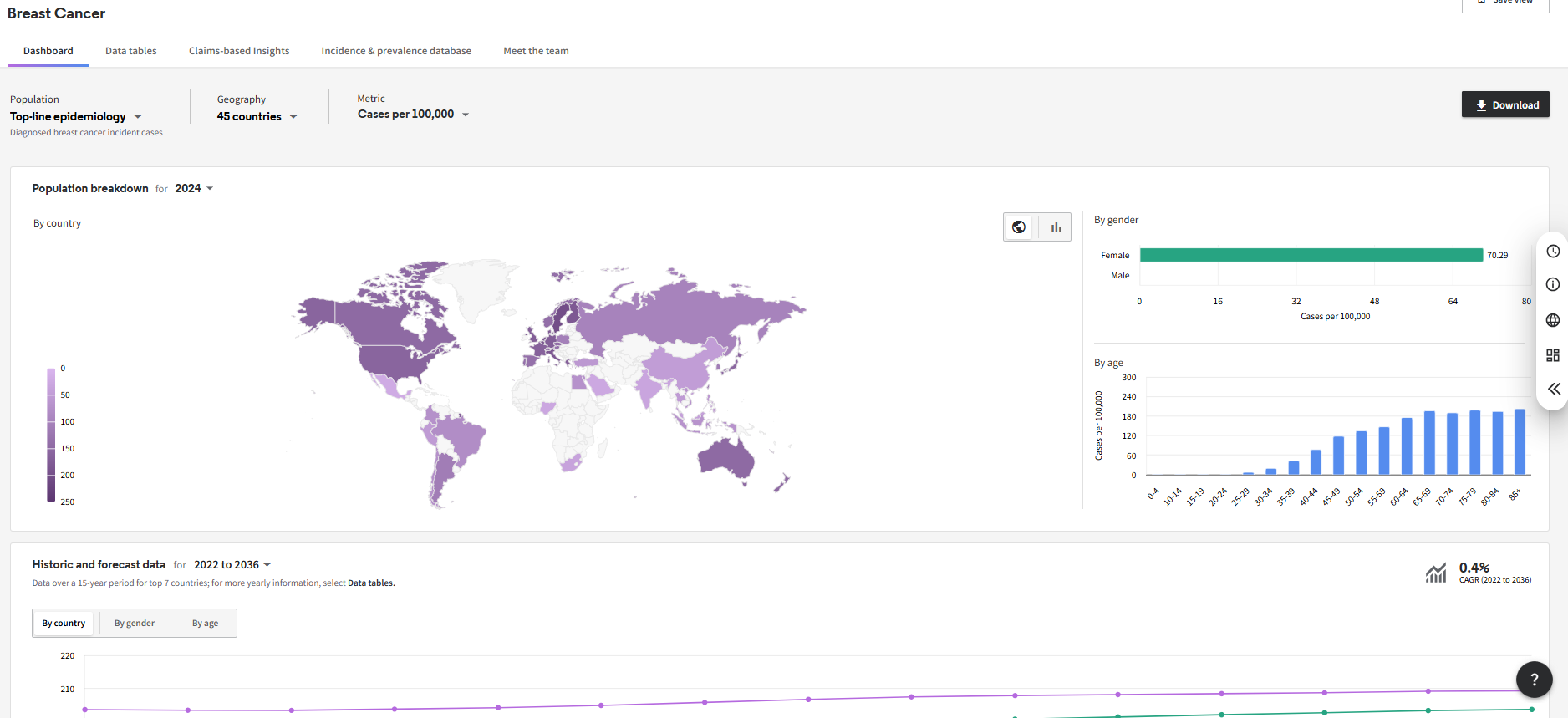 Clarivate Epidemiology Intelligence provides robust, data-driven insights into breast cancer across global markets, covering mature, emerging, and 126 additional markets via our Extrapolated Worldwide Coverage dashboard.