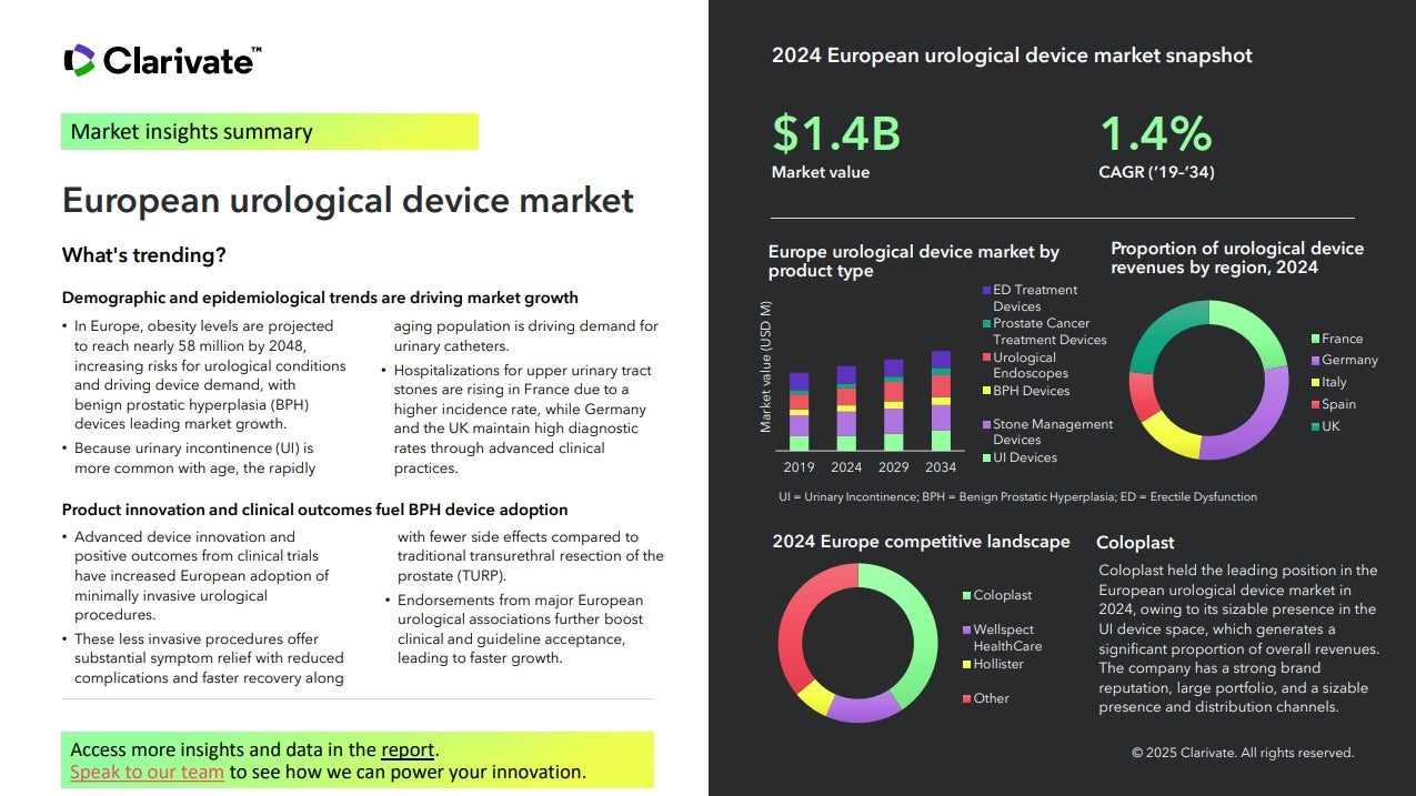 Read our Market Snapshot to access data and analysis on the market for urological devices in Europe from 2019 through 2034.