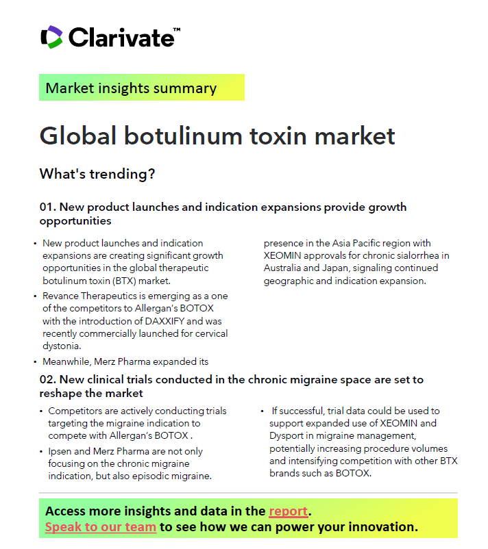 Read our Market Snapshot to access data and analysis on the state of the market for therapeutic BTX in the US, Europe, and the Asia Pacific region from 2019 through 2034.