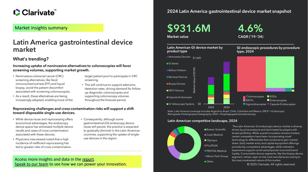 Read our Market Snapshot to access data and analysis on the state of the market for GI endoscopy devices in Latin America from 2019 through 2034.