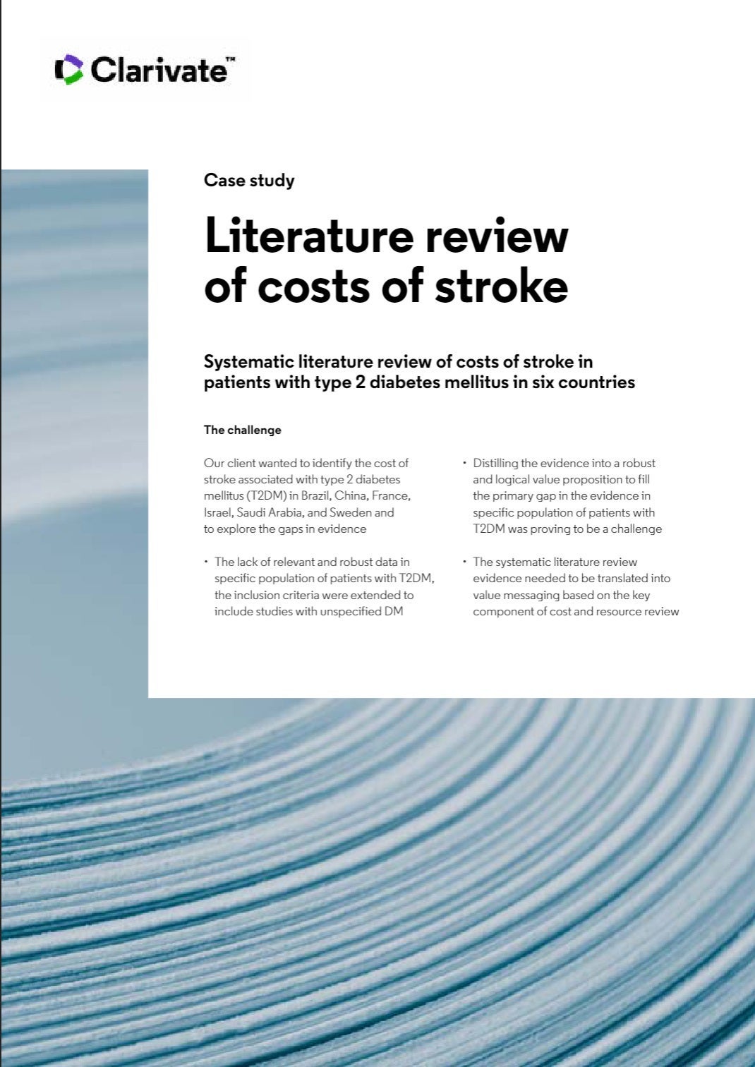 Our client wanted to identify the cost of stroke associated with type 2 diabetes mellitus (T2DM) in Brazil, China, France, Israel, Saudi Arabia, and Sweden and to explore the gaps in evidence.