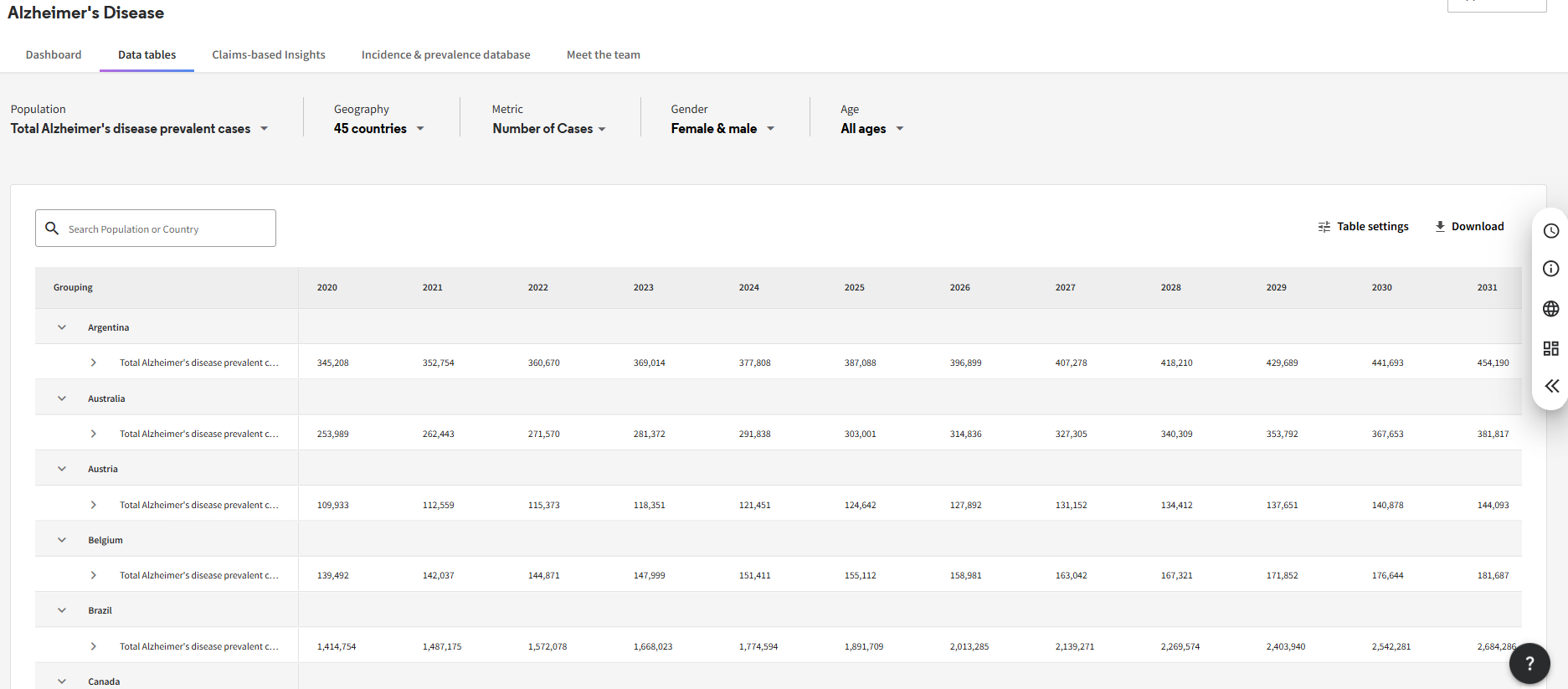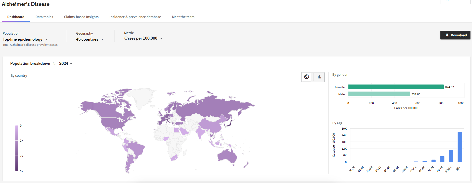 • Alzheimer’s Disease prevalence data: Global insights across 171 countries from 40+ expert epidemiologists.