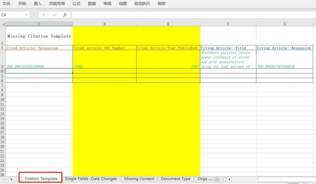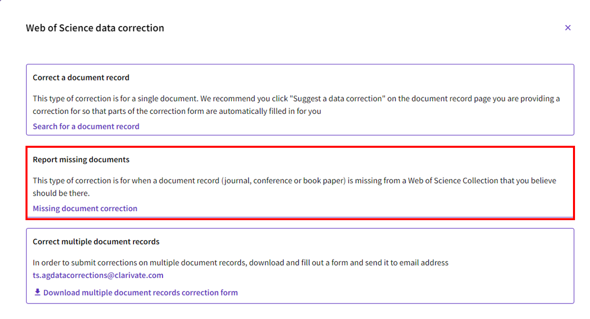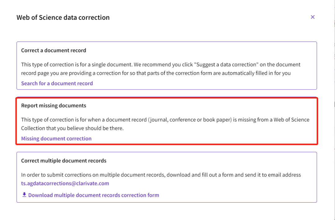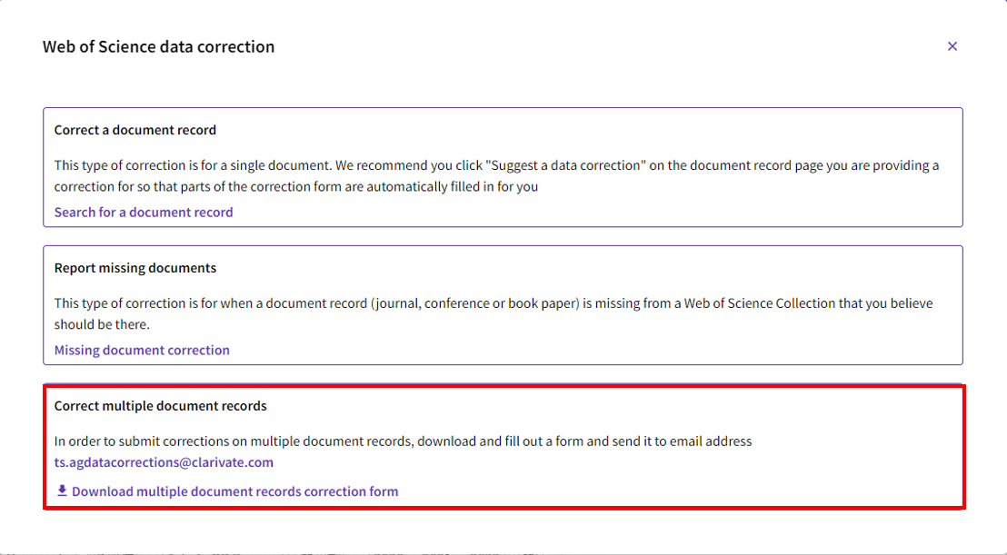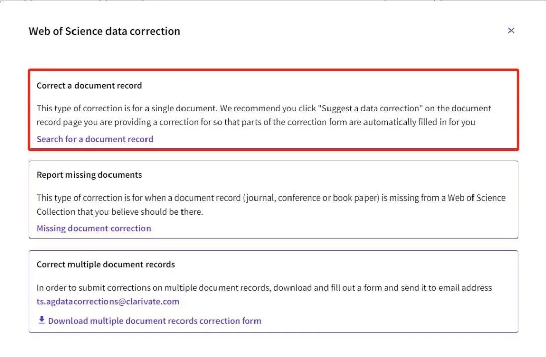 點選 Download Multiple document records correction form 下載表格,將被引文章和引用文獻逐一填寫到 Citation Template 表單中,再發送郵件至 ts.agdatacorrections@clarivate.com,隨後資料團隊會進行人工檢核。