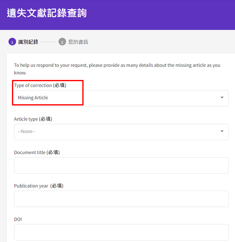 將 Type of correction 選擇為 Missing Article,按照頁面提示填寫漏檢文章的詳細資訊。