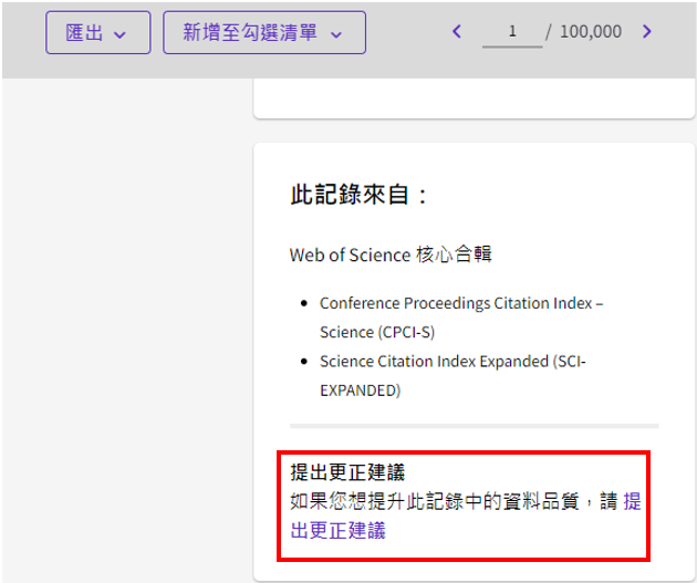 請用文章標題或者 DOI 號碼在 Web of Science 資料庫中查找您的文章,點擊標題進入文章全記錄頁面,在頁面的右側找到提出更正建議,