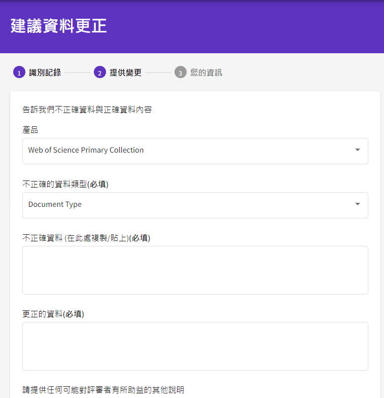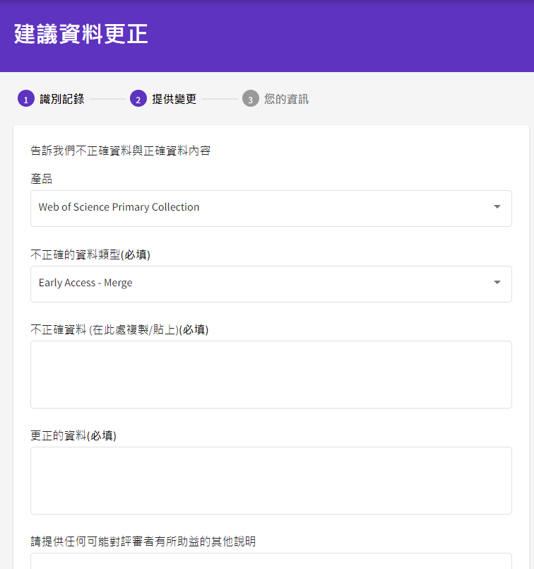 按照頁面提示填寫文章的詳細資訊,在第二步中的<資料不正確>項填入兩條記錄的 Web of Science 平臺入藏號,在<正確的資料>項填入 Please merge into one record,隨後資料團隊會進行合併處理。